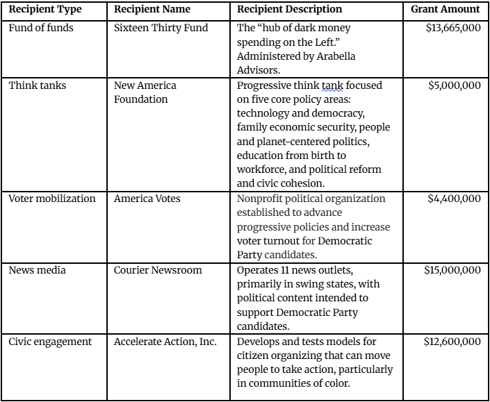 Near the end of his book, Palumbo examines Alex’s first year as OSF chairman (in 2023) by reviewing OSF’s largest grants. Because of the high volume of grants made in 2023, a total of 2,166, Palumbo divides the grants into five main categories: (1) fund of funds (meaning OSF funds groups who fund other groups); (2) think tanks; (3) voter mobilization groups; (4) news media; and (5) civic engagement groups. The table below shows OSF’s largest grants in 2023 for each of the five recipient categories: