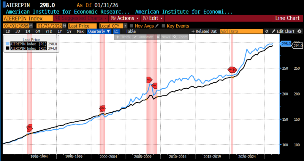 AIER Everyday Price Index vs. US Consumer Price Index (NSA, 1987 = 100)